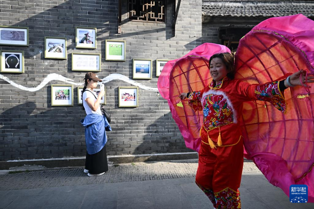 当日,在江苏省高邮市运河·盂城驿街区,木偶戏、挑花担、撂石锁等非遗项目表演吸引众多游人驻足观看。