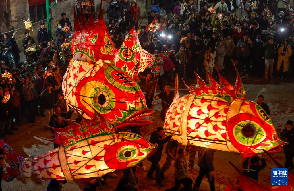 2025年2月10日晚,村民在安徽省黄山市歙县溪头镇汪满田村嬉鱼灯。新华社发(施亚磊 摄)