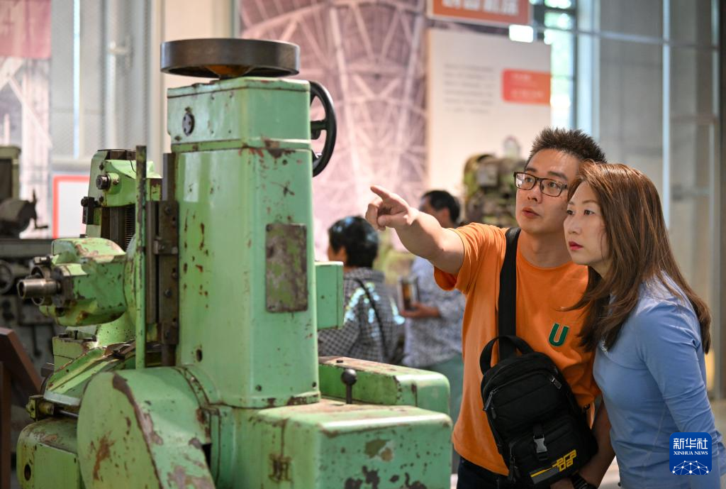5月18日,游客在天津机床工业博物馆参观机床展品。