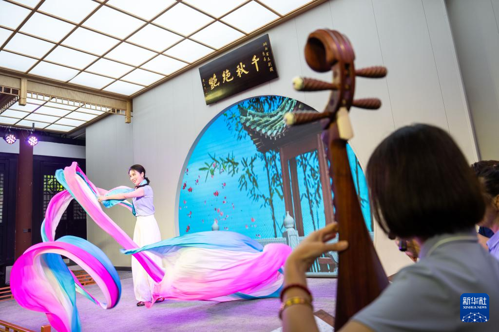6月4日,在郴州市北湖区人民路街道万花冲社区,湖南省昆剧团青年演员(左一、右一)在带领观众体验昆曲。