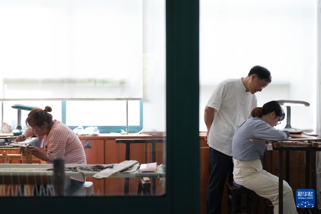 6月6日,在东台嘉丽发绣厂,东台发绣传承人陈伯余指导徒弟绣制发绣作品。