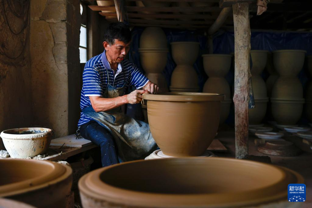 6月17日,制陶师傅方亮生在湖南省郴州市桂东县普乐镇陶瓷作坊制作陶器。