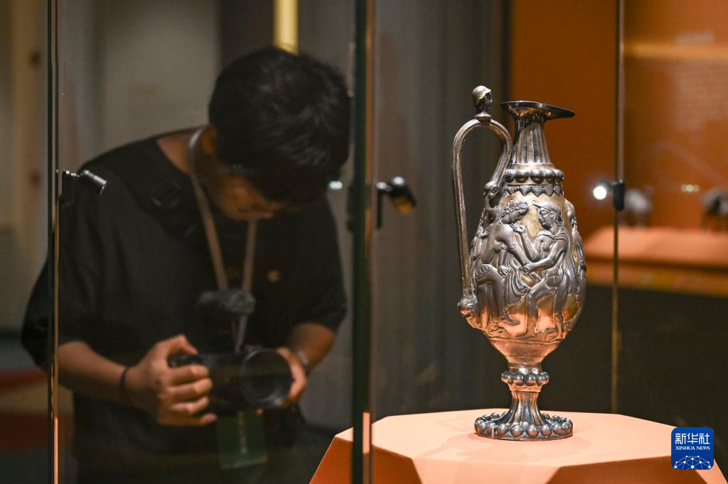 7月8日,媒体人员在“宁夏固原文物精品展”上拍摄展品鎏金银壶。