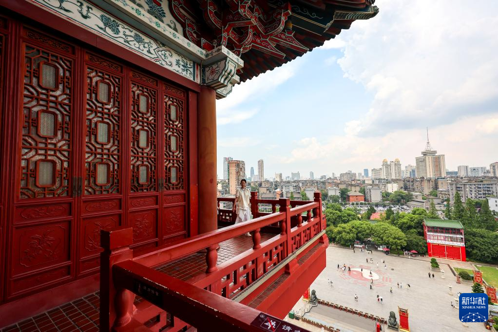 7月7日,身着古装的游客在江西南昌滕王阁景区游览留影。
