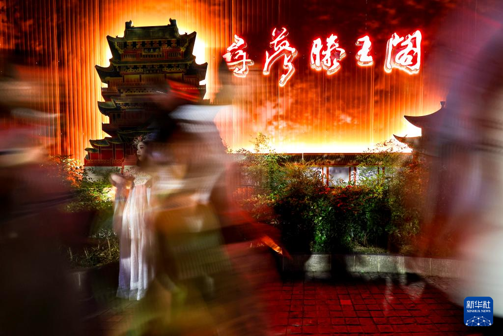 7月7日,夜间游览的游客在江西南昌滕王阁景区内打卡留影。
