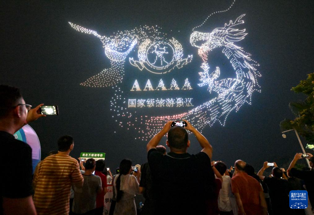 当日,广东河源市东源县万绿湖风景区举行大规模无人机灯光秀表演,万架无人机同时升空编队。