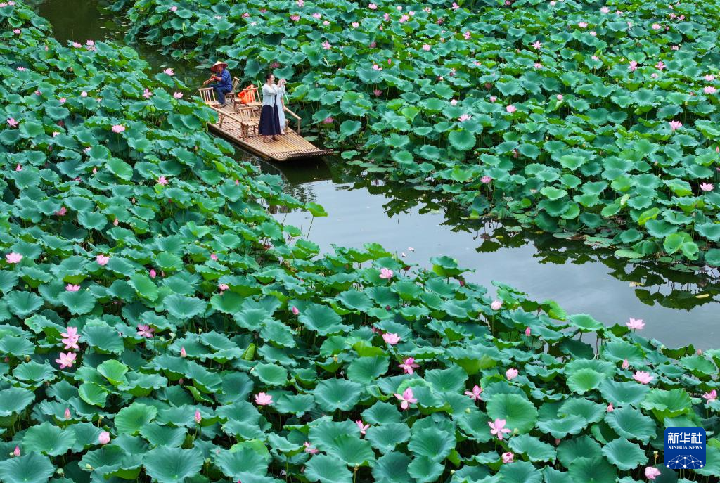 7月22日,游客在安徽省黄山市徽州区呈坎古村落游玩赏荷(无人机照片)。