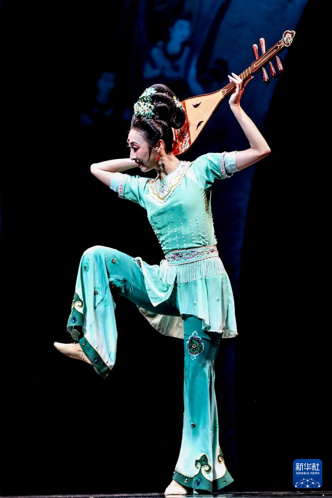 9月20日晚,演员在敦煌大剧院表演新版《丝路花雨》,展示经典舞姿“反弹琵琶”。