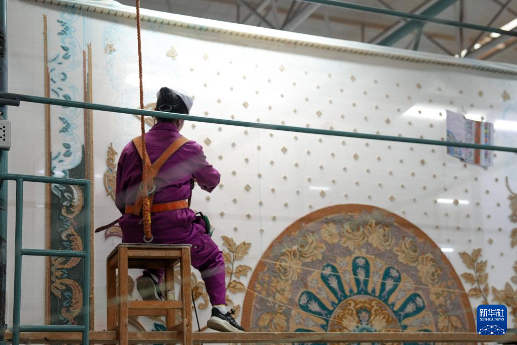 9月27日,在西宁市圣源地毯集团有限公司生产车间,一名操作工从展示的藏毯前走过。