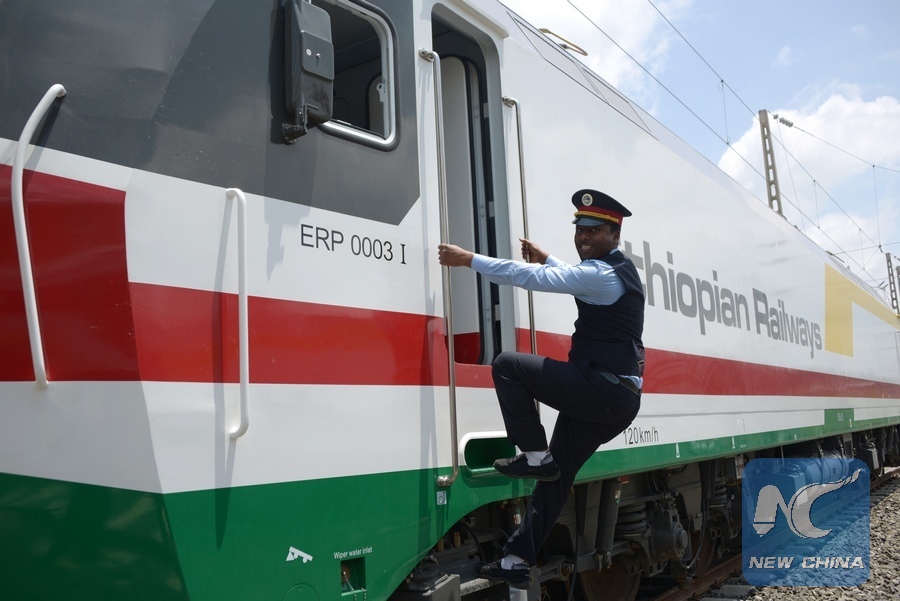 An Ethiopian driver gets on the train in Addis Ababa, Ethiopia, Oct. 1, 2016. A Chinese-built railway linking the Ethiopian capital and the port of Djibouti is expected to help the landlocked African country improve access to the sea and speed up a burgeoning industrialization process. (Xinhua/Sun Ruibo)
