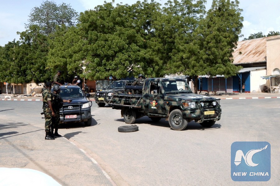 File photo shows army officers patrol the site of the suicide bomb attack in Maroua, capital of Far North Region of Cameroon, July 22, 2015. (Xinhua/FM Photo)