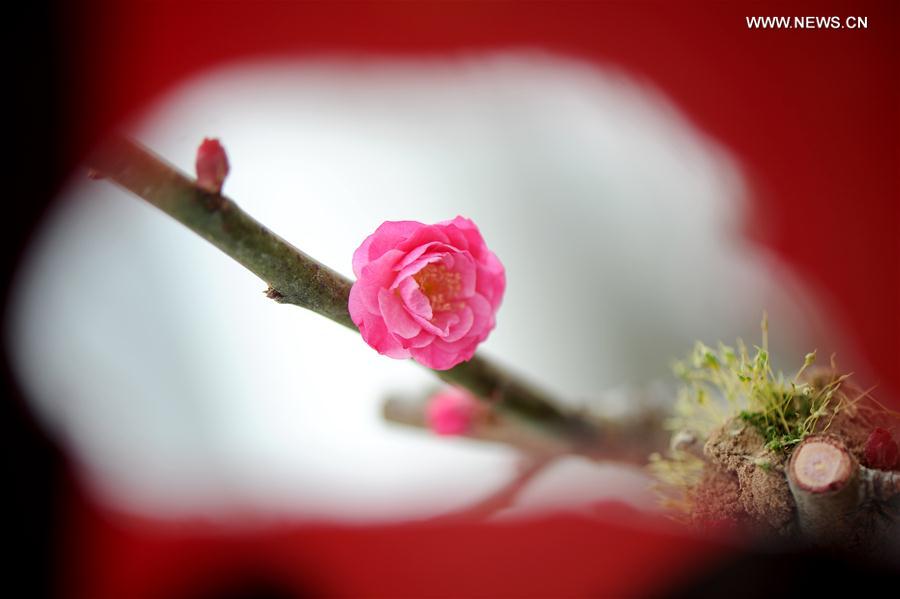 A plum flower blooms in Xi'an Botanic Garden in Xi'an, capital of northwest China's Shaanxi Province, Jan. 26, 2017. (Xinhua/Zhang Shuzhong)
