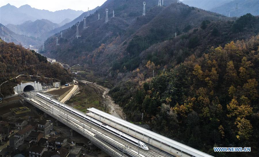 A bullet train runs through Zhaojialing tunnel during a test run in northwest China's Shaanxi Province, Nov. 22, 2017. High-speed trains linking Xi'an, capital of Shaanxi Province, and Chengdu, capital of Sichuan Province, began operation on Dec. 6, 2017. (Xinhua/Tao Ming)