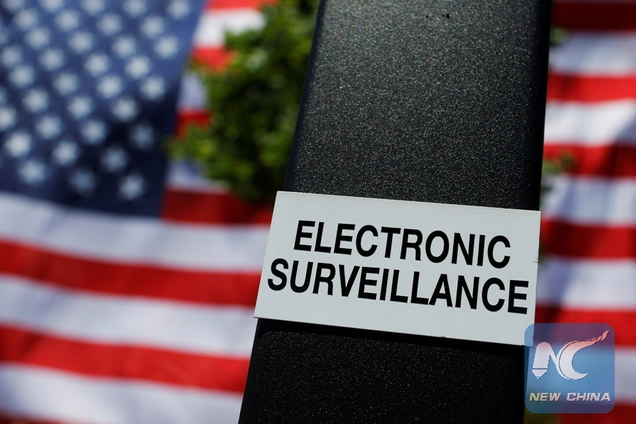 File Photo: A notice of electronic surveillance is posted near a 95-by-50-foot American flag unfurled on the side of an apartment complex, a replica of the "The Great Flag" that was spun, woven, dyed, constructed and displayed on the same building by Amoskeag Manufacturing Company in 1914, in Manchester, New Hampshire, U.S., June 14, 2017. (Xinhua/REUTERS)