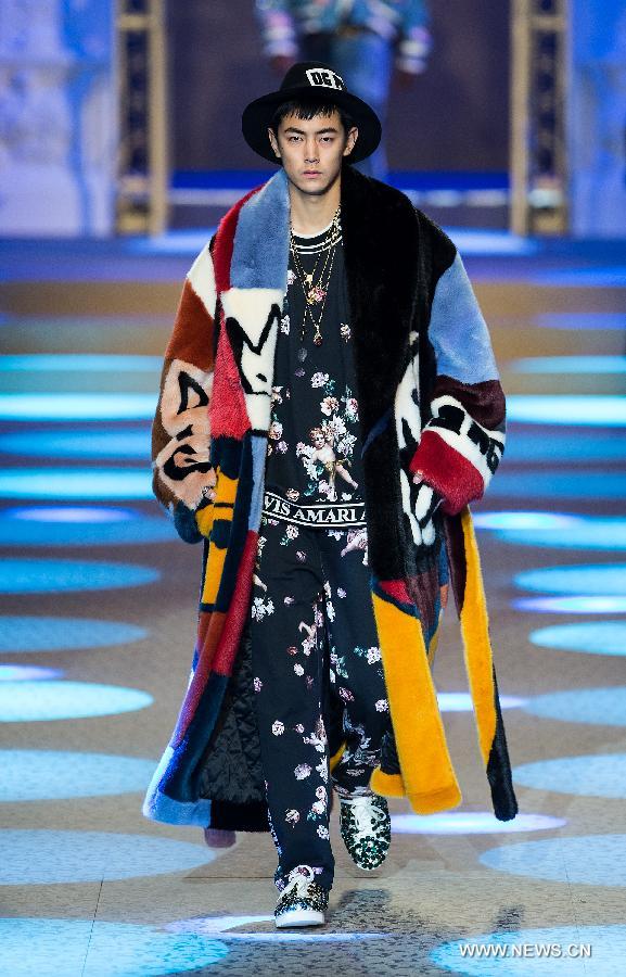 A model presents creations for fashion house Dolce&Gabbana during Milan Men's Fashion Week Fall/Winter 2018/19 in Milan, Italy, Jan. 13, 2018.(Xinhua/Jin Yu)