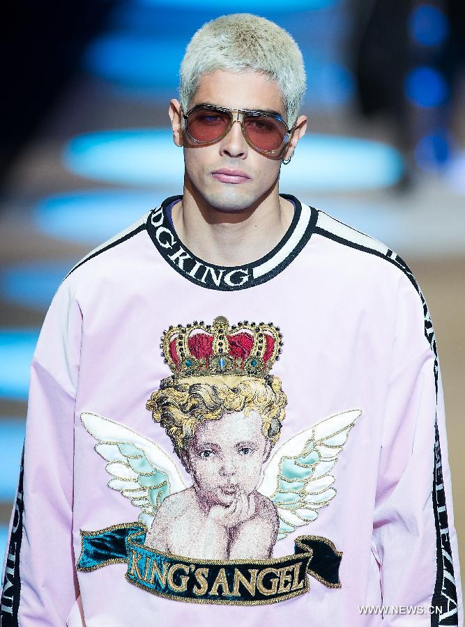 A model presents creations for fashion house Dolce&Gabbana during Milan Men's Fashion Week Fall/Winter 2018/19 in Milan, Italy, Jan. 13, 2018.(Xinhua/Jin Yu)