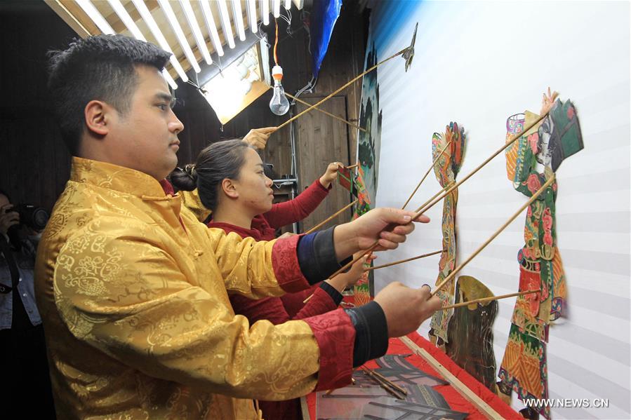 Liu Zhaokan (L), an inheritor of shadow puppet play, manipulates leather puppets for the shadow play in Tengchong City, southwest China's Yunnan Province, Nov. 23, 2017. Liu, born in 1992, is the sixth generation inheritor of shadow puppet play in Liujiazhai of Tengchong. Liu established a shadow puppet center in Tengchong to promote the industrial development of the traditional folk art. Shadow play, performed by manipulating flat leather puppets against a lit-up translucent screen, was registered in the Representative List of the Intangible Cultural Heritage of Humanity by the UNESCO in 2011. (Xinhua/Jing Huihui)