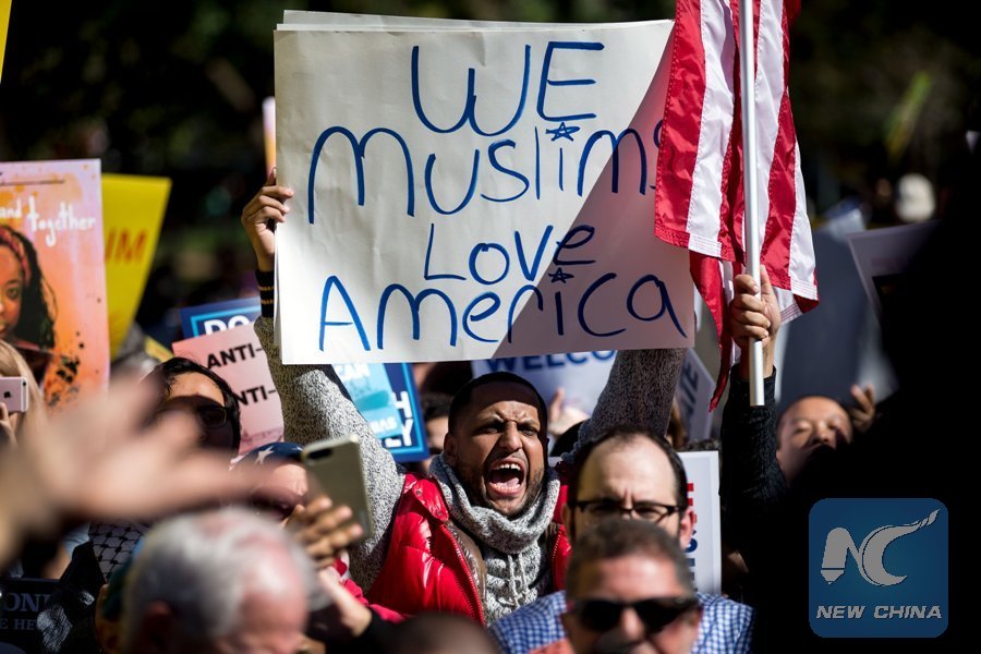 People protest against the new travel restrictions near the White House in Washington D.C., the United States, on Oct. 18, 2017. (Xinhua/Ting Shen)