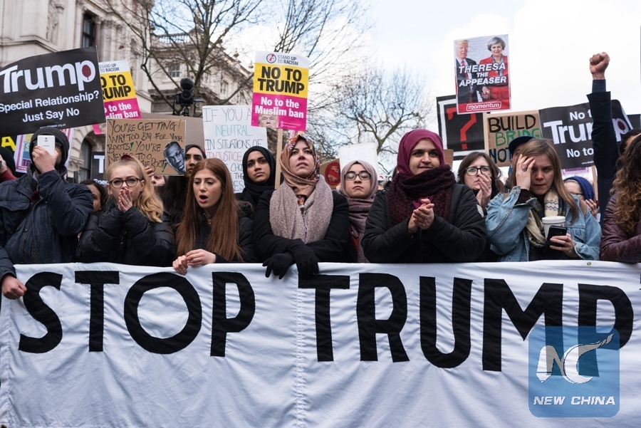 Thousands of demonstrators protest against Donald Trump travel ban on Muslim's travelling to the United States in central London on Feb. 4, 2017. (Xinhua/Ray Tang)
