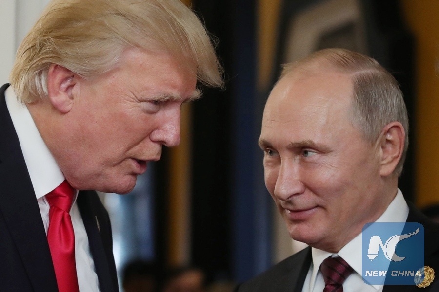 File photo taken on Nov. 11, 2017 shows U.S. President Donald Trump (L) speaking with Russian President Vladimir Putin as they attend the APEC Economic Leaders' Meeting in Danang, Vitenam. (Xinhua/AFP)