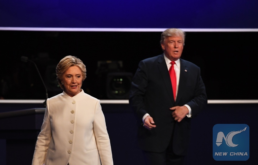 File Photo: Republican presidential candidate Donald Trump (R) and Democratic presidential candidate Hillary Clinton participate in the third and final presidential debate at the University of Nevada Las Vegas, the United States, Oct. 19, 2016. (Xinhua/Yin Bogu)