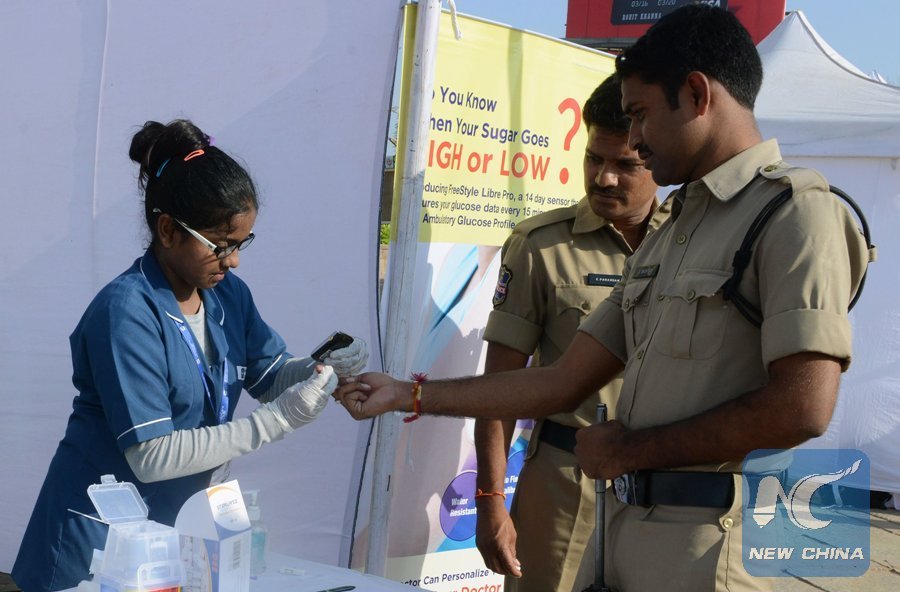 An Indian nurse (L) collects a blood sample from police using a glucometer at a free diabetic health check up camp on World Health Day in Hyderabad on April 7, 2016. (Xinhua/AFP Photo)