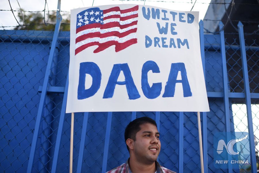 File photo taken on Sept. 10, 2017 shows DACA recipient and appliance repair business owner Erick Marquez during a protest in support of DACA (Deferred Action for Childhood Arrivals) in Los Angeles, California. (Xinhua/AFP)
