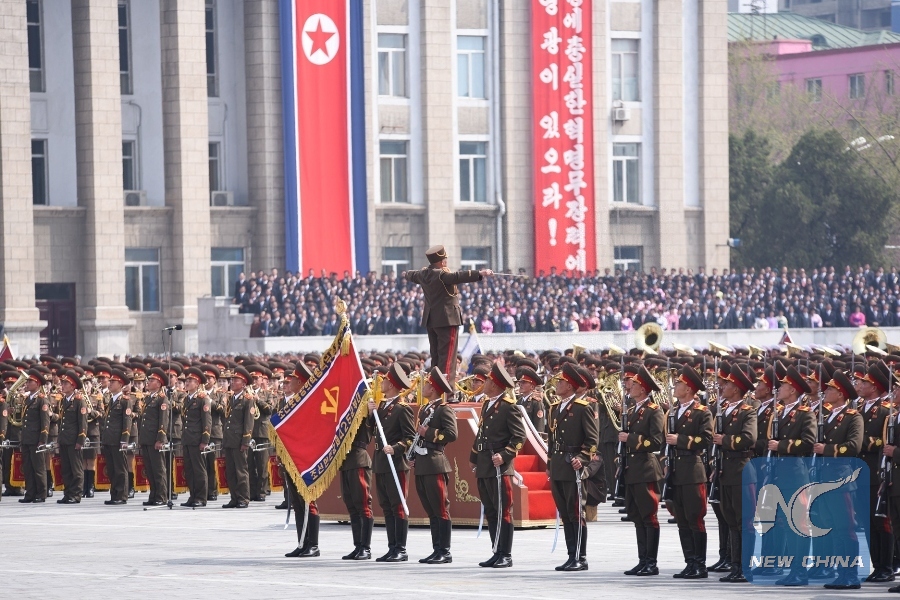 Soldiers attend a military parade in central Pyongyang, April 15, 2017. The Democratic People's Republic of Korea (DPRK) showcased its military muscles by parading all of its most-advanced ballistic and tactic missiles, including a submarine-launched ballistic missile which could strike targets 1000 km away. (Xinhua/Cheng Dayu)