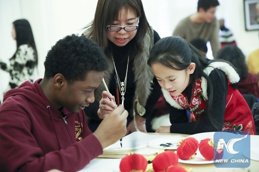 A student from Medgar Evers College Preparatory School of New York learns how to paint with a brush pen during a culture exchange event in New York, the United States, Feb. 2, 2018. (Xinhua/Wang Ying)