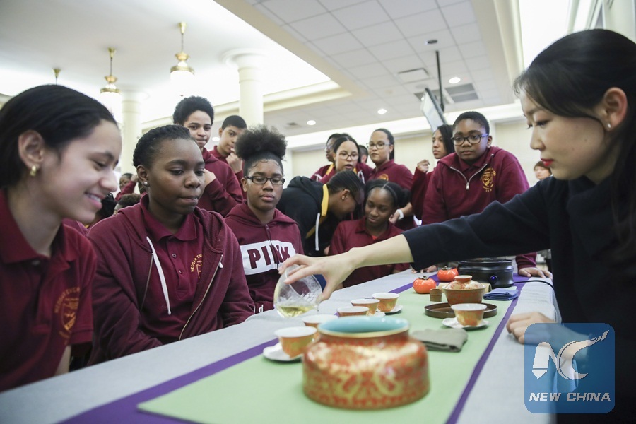 Students from Medgar Evers College Preparatory School of New York taste Chinese tea during a culture exchange event in New York, the United States, Feb. 2, 2018. (Xinhua/Wang Ying)