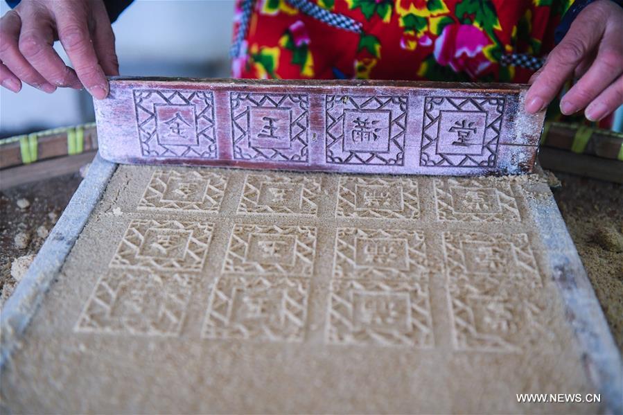 A villager makes sweet potato cakes at Xinglian Village in Donglin Township of Huzhou, east China's Zhejiang Province, Jan. 31, 2018. Villagers in Donglin Township make all kinds of delicious traditional food to greet the upcoming Spring Festival, which falls on Feb. 16 this year. (Xinhua/Xu Yu)