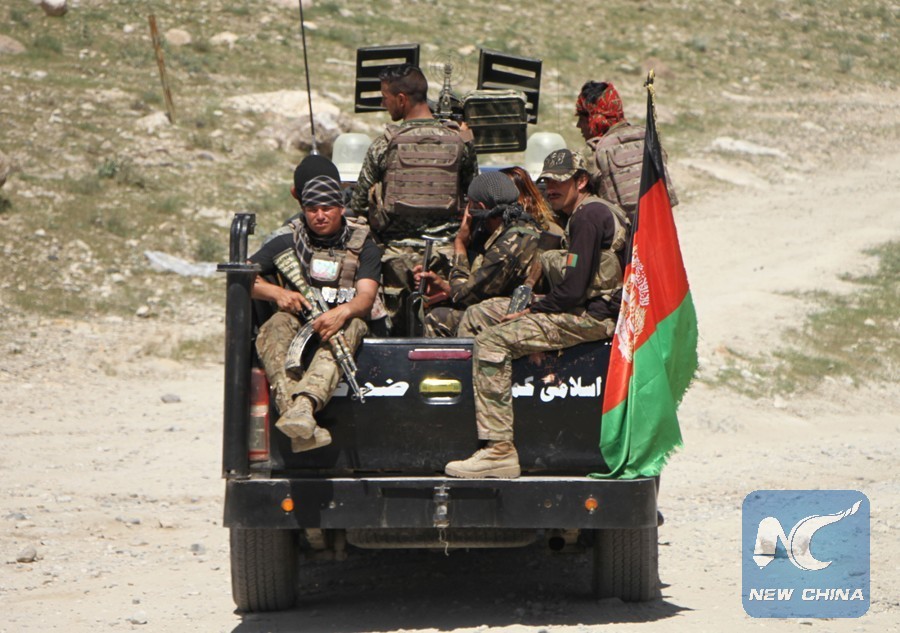 Afghan army soldiers are deployed to Achin district of Nangarhar province, Afghanistan, after the U.S. military dropped a GBU-43 or Massive Ordnance Air Blast (MOAB) bomb on an IS cave complex in Achin district, on April 14, 2017. (Xinhua/Rahman Safi)