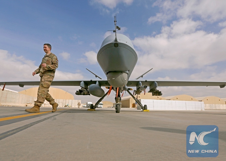 A U.S. service member passes in front of a MQ-9 Reaper drone, one of a squadron that has arrived to step up the fight against the Taliban, at the Kandahar air base, Afghanistan, Jan. 23, 2018. (Xinhua/REUTERS)