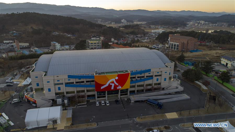 Photo taken on Jan. 12, 2018 shows an aerial view of Gangneung Curling Centre of Gangneung Coastal Cluster for PyeongChang 2018 Winter Olympic Games in PyeongChang, South Korea. Gangneung Curling Centre will hold Curling events during the Games. (Xinhua/Lui Siu Wai)