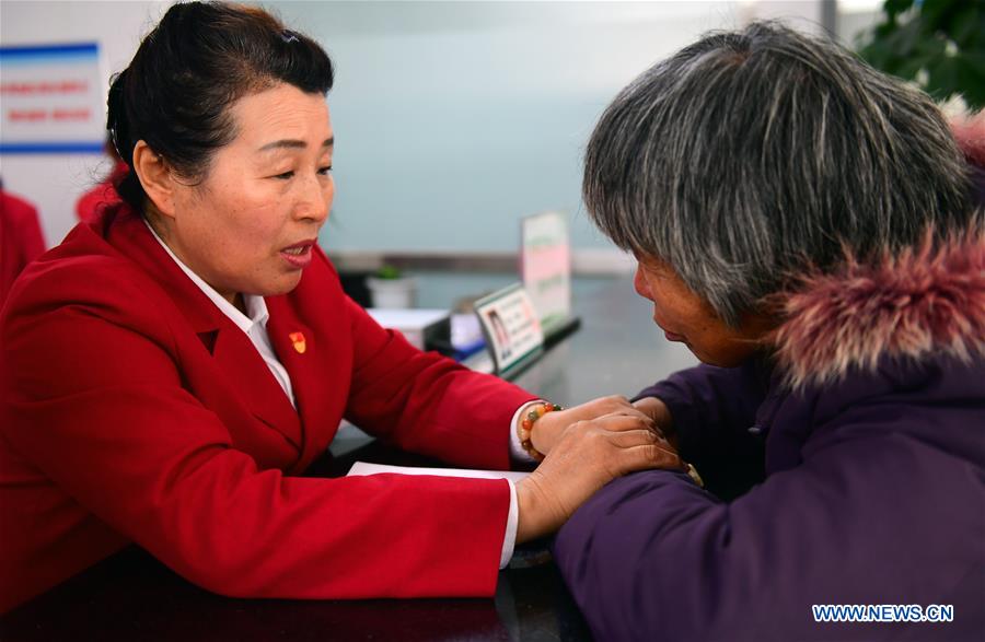 Wu Yaqin consoles an aged low-income resident at Changshanhuayuan community service center in Tuanshan subdistrict, Kuancheng district, Changchun City of northeast China's Jilin Province, Dec. 11, 2017. Wu Yaqin, a delegate to the 19th National Congress of the Communist Party of China, served as a community Party secretary. "Serving the people wholeheartedly is to treat even minor problems of the others' as major hardships of your own." This is a motto of Wu and her peers working in the communities. (Xinhua/Lin Hong)