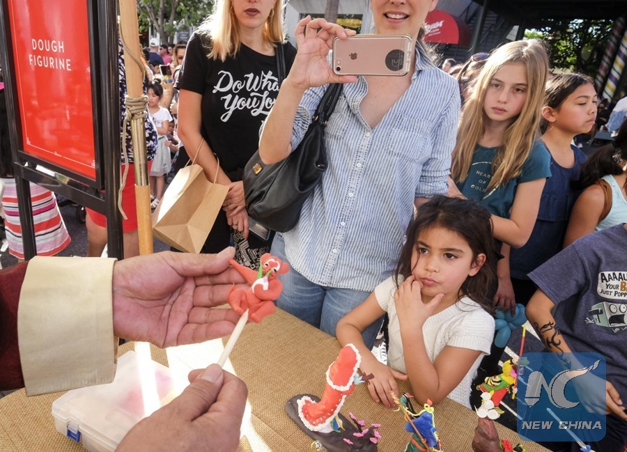 A dough figurine artist makes an animal figurine during a celebration for Chinese lunar new year at the Original Farmers Market in Los Angeles, the United States, Jan. 28, 2018. (Xinhua/Zhao Hanrong)