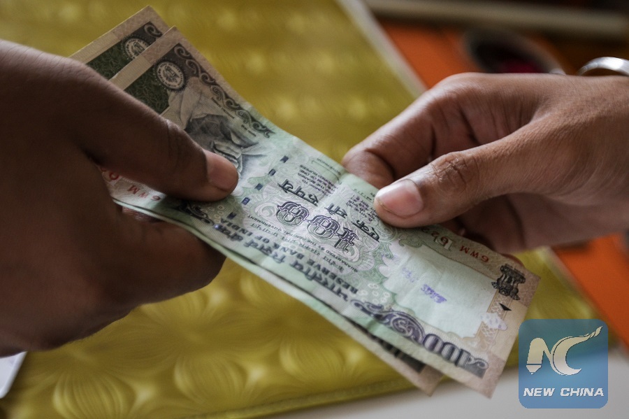 A man uses rupee to buy things at a shop near Broach, India, Aug. 21, 2013. (Xinhua/Zheng Huansong)