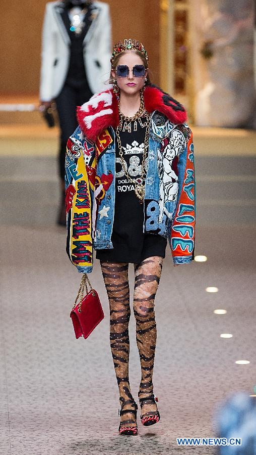 A model presents a creation of Dolce&Gabbana "Fashion Devotion" Autumn/Winter?18/19 women's collection during Milan Fashion Week in Milan, Italy, Feb. 25, 2018. (Xinhua/Jin Yu)