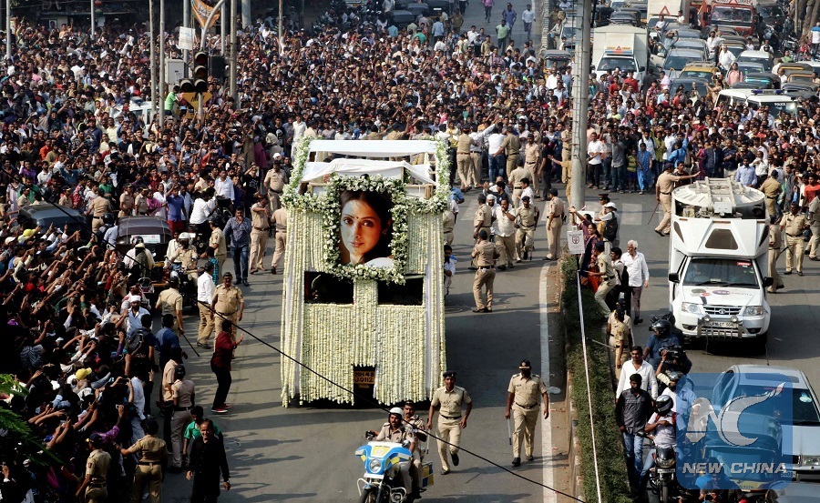 NEW DELHI, Feb. 28 (Xinhua) -- The funeral procession of Indian Bollywood superstar Sridevi which began Wednesday late afternoon in India's western city of Mumbai culminated at crematorium, where her family will be performing the actress's last rites.