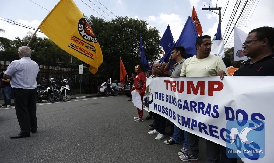 Members of trade unions hold a protest against U.S. President Donald Trump's import surcharge on Brazilian steel and in defense of their employment, outside the U.S. Consulate in Sao Paulo, Brazil, on March 5, 2018. (Xinhua/AFP)