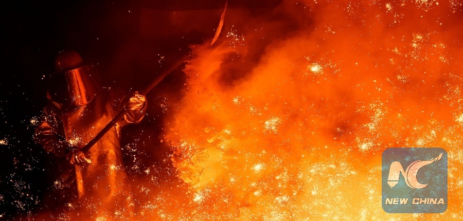 File photo taken on March 17, 2015 shows a melter putting sand on flowing steel at a furnace of German steel technology group Salzgitter AG in Salzgitter. (Xinhua/AFP)