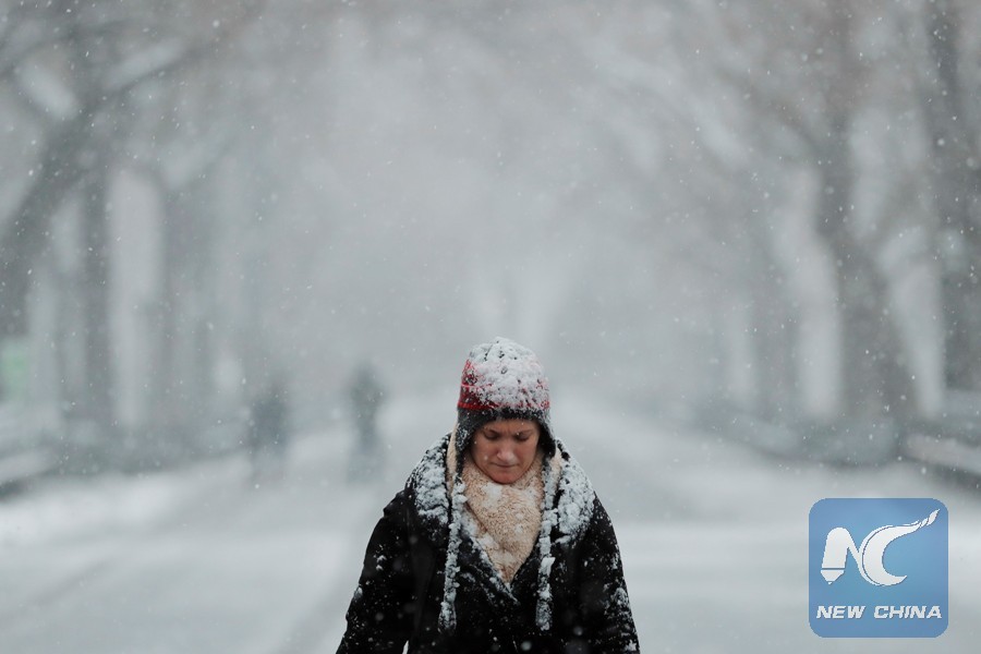A pedestrian walks through Central Park during a snow storm in New York, U.S., March 7, 2018. (Xinhua/REUTERS)