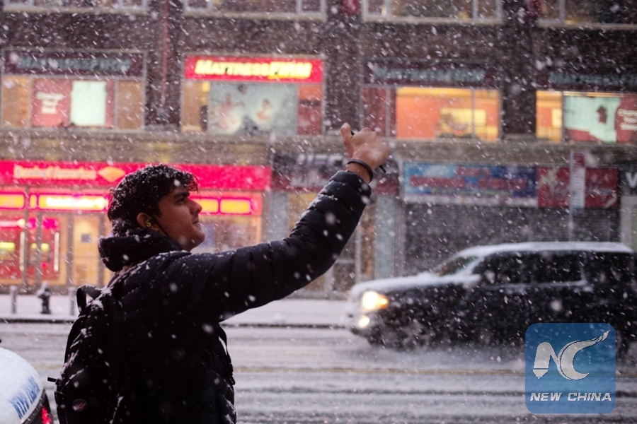 A man takes selfie in the snowstorm in Manhattan of New York City, the United States, March 7, 2018. (Xinhua/Li Muzi)