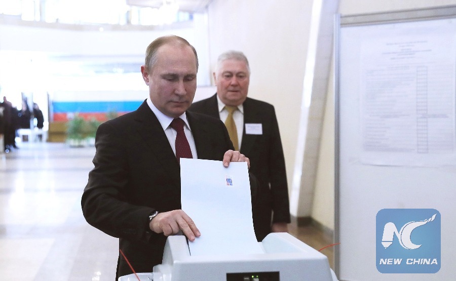 Russian President Vladimir Putin casts his vote in a polling station in Moscow, Russia, on March 18, 2018. (Xinhua/ Kremlin Pool)