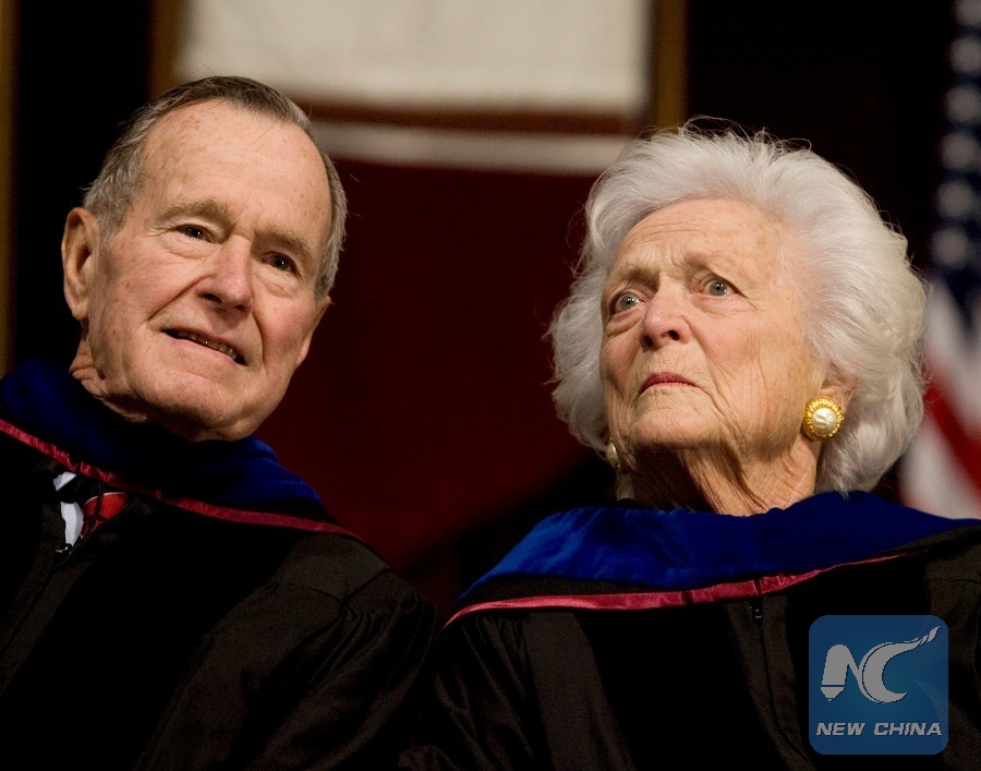 File Photo: Former President George H.W. Bush (L), and former first lady Barbara Bush attend the Texas A&M University commencement ceremony in College Station, Texas, Dec. 12, 2008. (Xinhua/REUTERS)