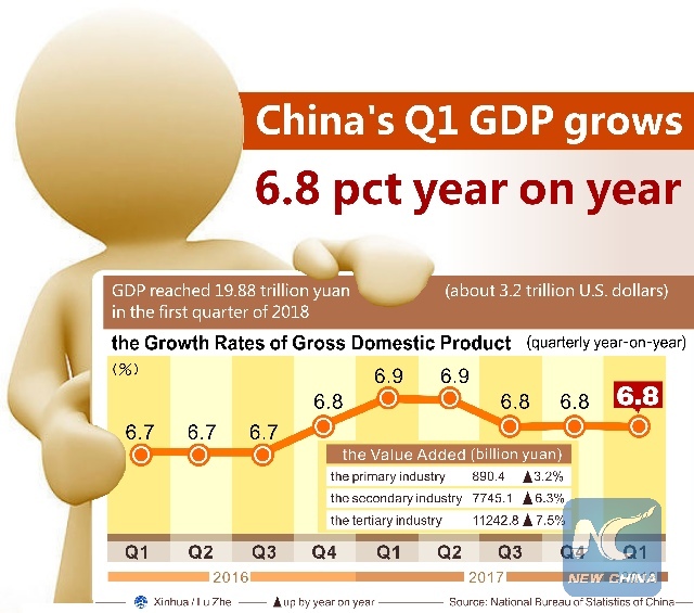 Graphics shows the Chinese economy saw a solid start to the year with a 6.8-percent growth in the first quarter, official data showed on April 17, 2018. (Xinhua/Meng Lijing)