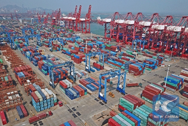 Photo taken on April 13, 2018 shows a container wharf in the harbour of Lianyungang, east China's Jiangsu Province. (Xinhua/Geng Yuhe)