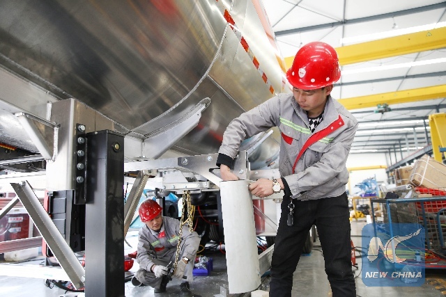 Workers assemble tank cars at a factory in Lianyungang of east China's Jiangsu Province, April 16, 2018. (Xinhua/Si Wei)