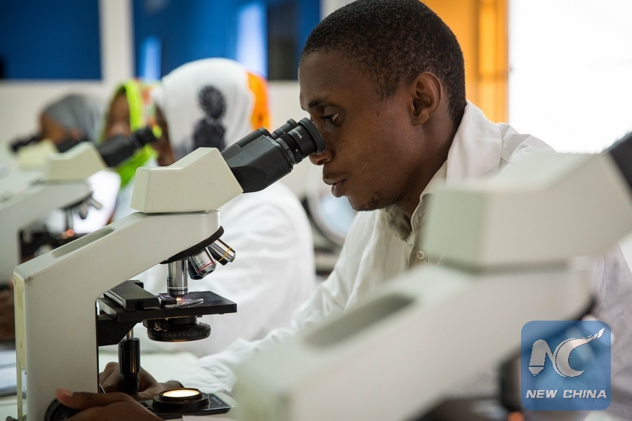 A technician looks for malaria parasites in a lab inside Comoros' anti-malaria center, April 17, 2018. Malaria kills about half a million people every year in the world, with Africa claiming some 90 percent of the casualties. (Xinhua/Lyu Shuai)