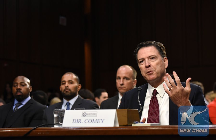 Former Director of Federal Bureau of Investigations James Comey speaks during a Senate Intelligence Committee hearing on Capitol Hill, in Washington D.C., the United States, on June 8, 2017. (Xinhua/Yin Bogu)
